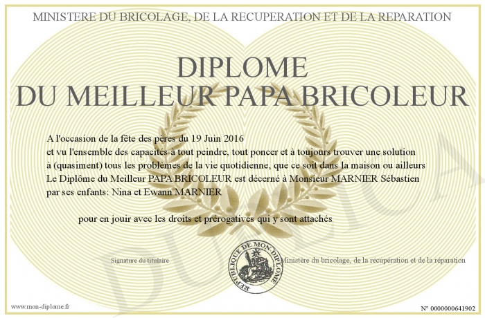 Envoyez par email votre Diplôme du meilleur papa bricoleur personalisé