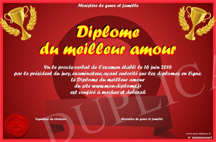 Envoyez par email votre Diplôme du meilleur amour personalisé