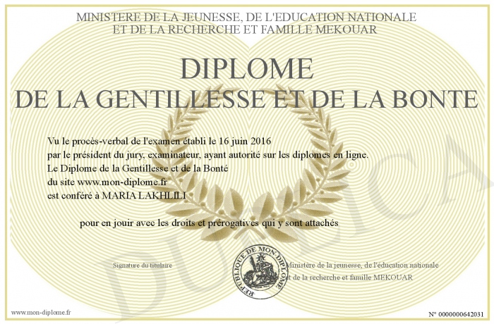 Envoyez par email votre Diplôme de la Gentillesse et de la Bonté personalisé