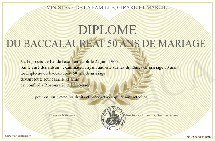 Envoyez par email votre Diplôme du baccalauréat 50 ans de mariage personalisé