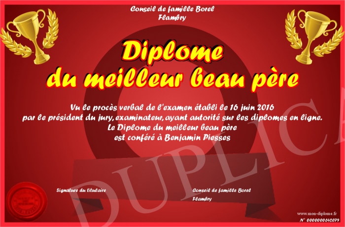 Envoyez par email votre Diplôme du meilleur beau père personalisé