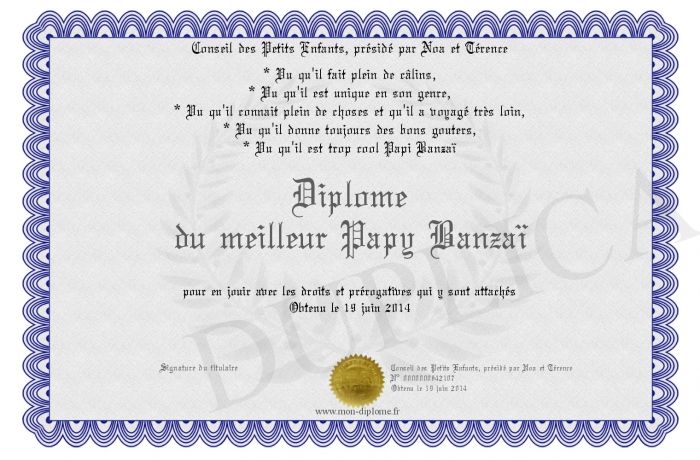 Envoyez par email votre Diplôme du meilleur Papy Banzaï personalisé