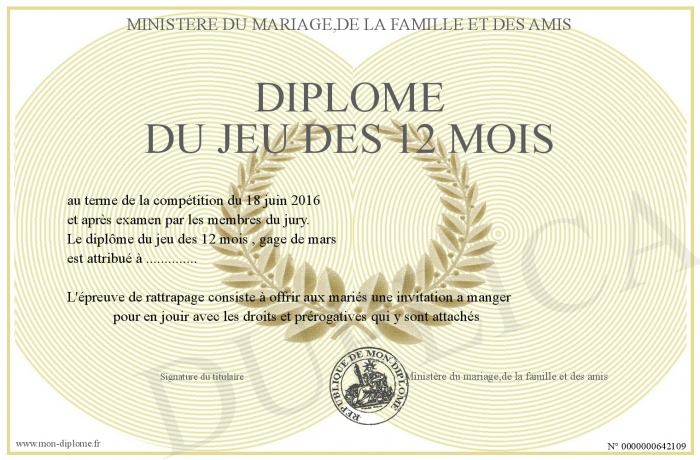 Envoyez par email votre Diplôme du jeu des 12 mois personalisé
