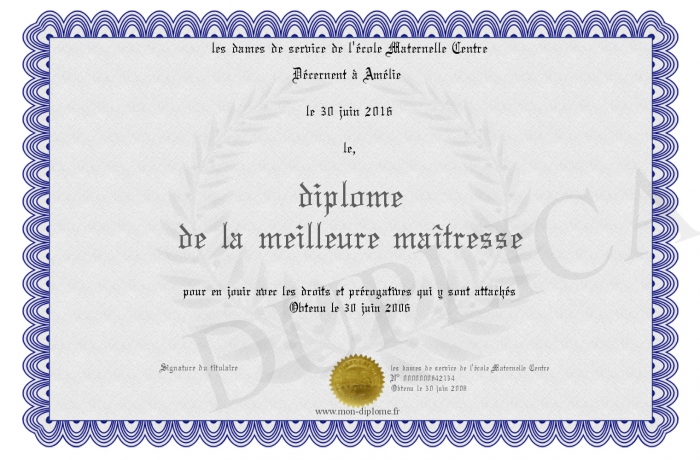 Envoyez par email votre diplôme de la meilleure maîtresse personalisé