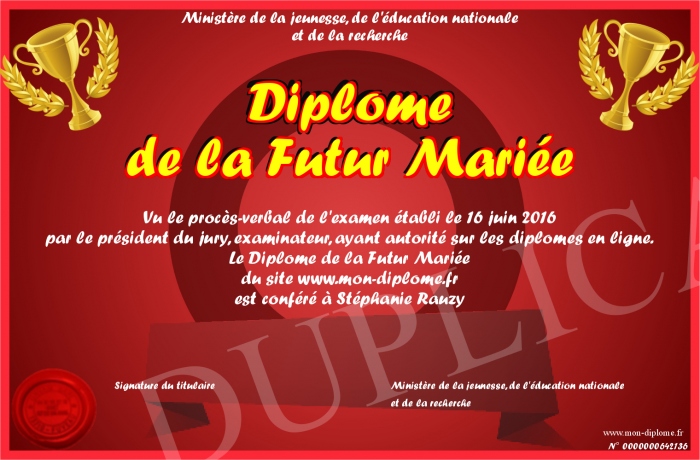 Envoyez par email votre Diplôme de la Futur Mariée personalisé