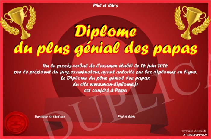 Envoyez par email votre Diplôme du plus génial des papas personalisé