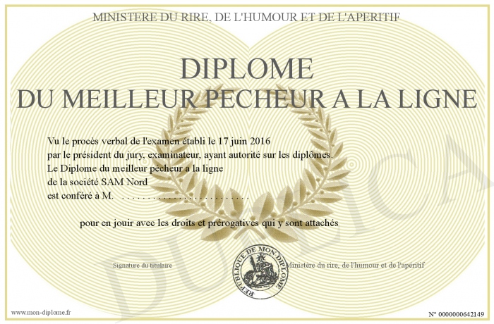 Envoyez par email votre Diplôme du meilleur pécheur a la ligne personalisé