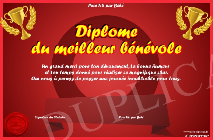 Envoyez par email votre Diplôme du meilleur bénévole personalisé