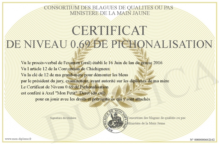 Envoyez par email votre Certificat de Niveau 0.69 de Pichonalisation personalisé