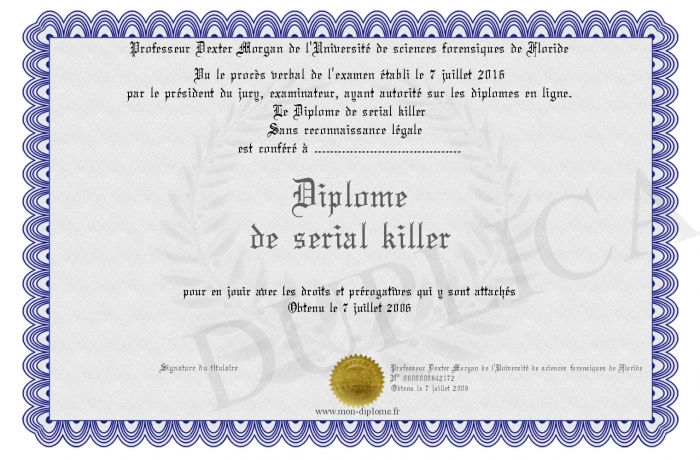 Envoyez par email votre Diplome de serial killer personalisé