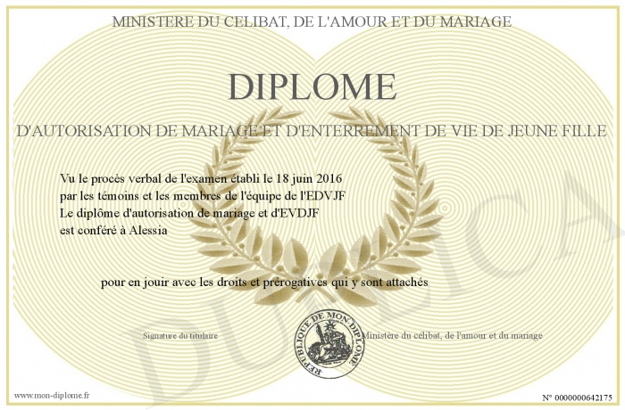 Envoyez par email votre Diplôme d'autorisation de mariage et d'enterrement de vie de jeune fille personalisé