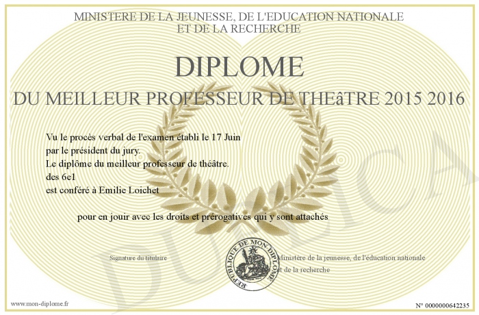 Envoyez par email votre Diplôme du meilleur professeur de théâtre 2015 2016 personalisé