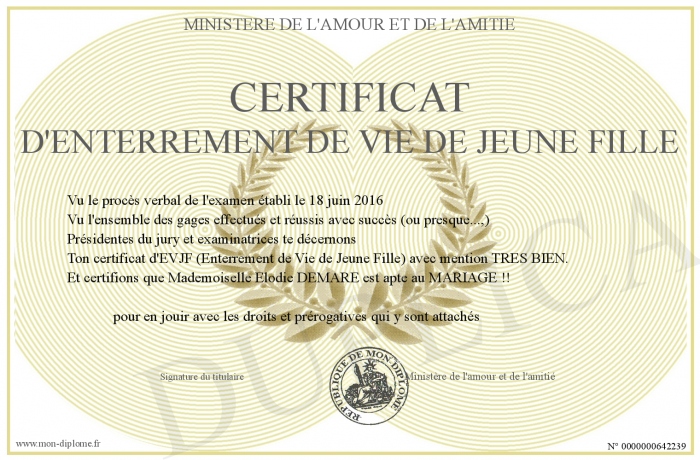 Envoyez par email votre Certificat d'enterrement de vie de jeune fille personalisé