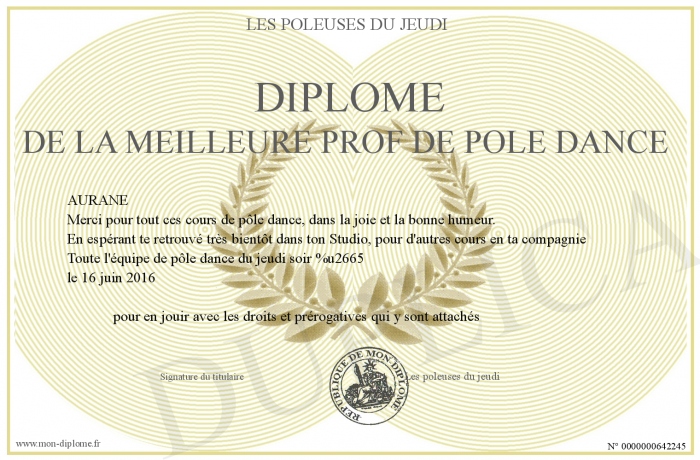 Envoyez par email votre Diplôme de la meilleure prof de pôle dance personalisé