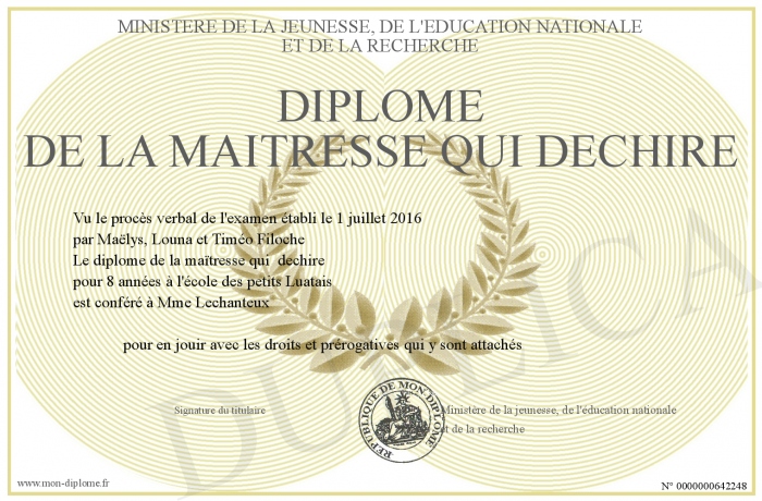 Envoyez par email votre Diplôme de la Maitresse qui dechire personalisé