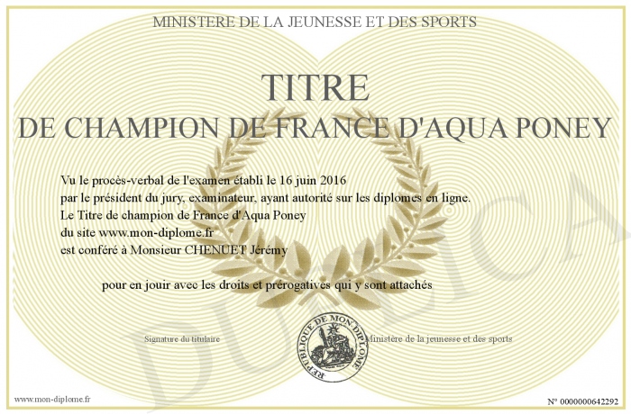 Envoyez par email votre Titre de champion de France d'Aqua Poney personalisé