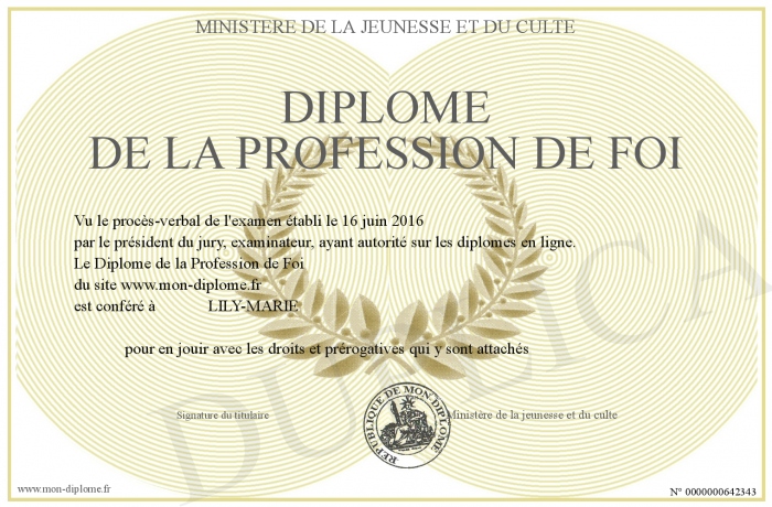 Envoyez par email votre Diplôme de la Profession de Foi personalisé