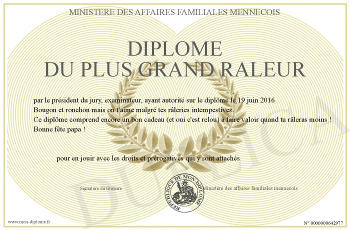 Envoyez par email votre Diplôme du plus grand raleur personalisé