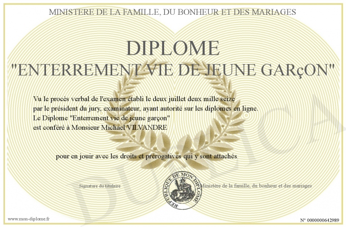 Envoyez par email votre Diplôme -Enterrement vie de jeune garçon- personalisé