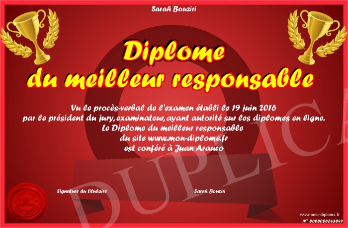 Envoyez par email votre Diplôme du meilleur responsable personalisé