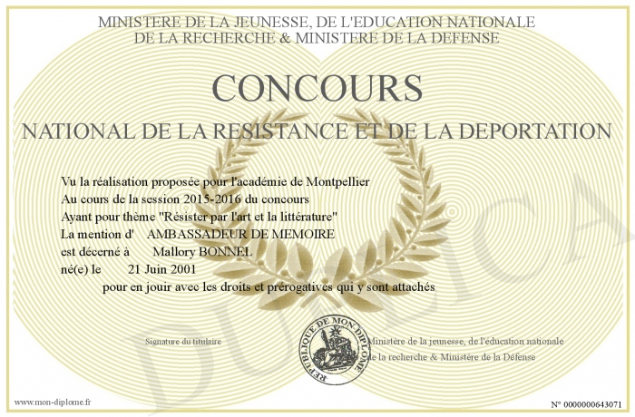 Envoyez par email votre CONCOURS NATIONAL DE LA RESISTANCE ET DE LA DEPORTATION personalisé