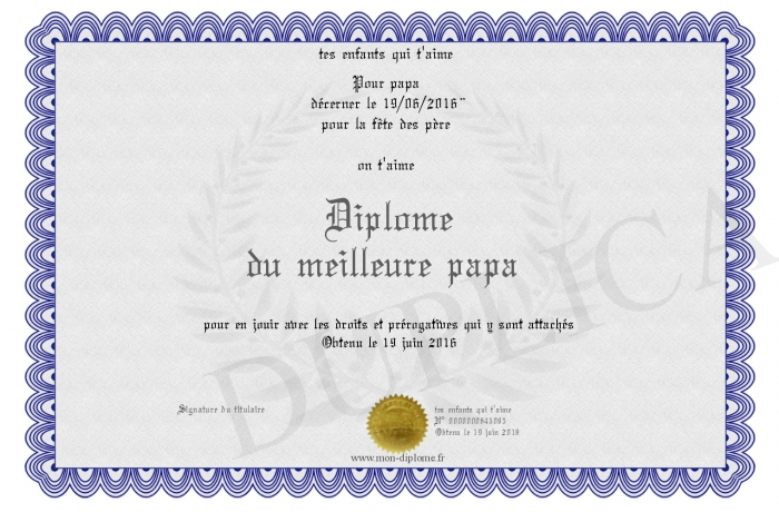 Envoyez par email votre Diplôme du meilleure papa personalisé
