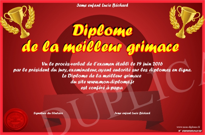 Envoyez par email votre Diplôme de la meilleur grimace personalisé