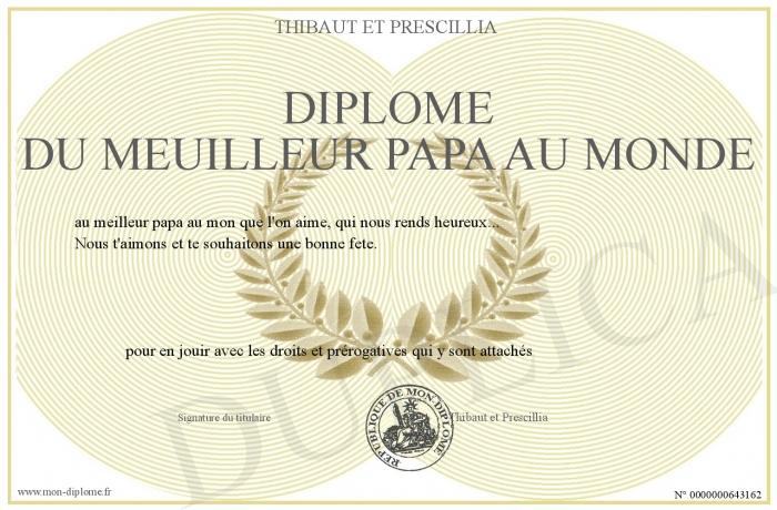 Envoyez par email votre Diplôme du meuilleur papa au monde personalisé
