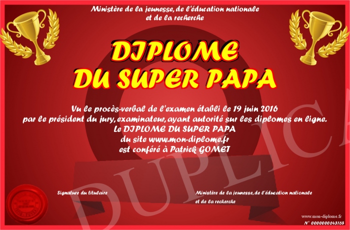Envoyez par email votre DIPLOME DU SUPER PAPA personalisé