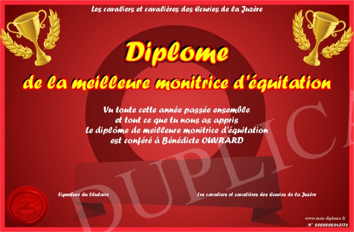 Envoyez par email votre Diplôme de la meilleure monitrice d'équitation personalisé