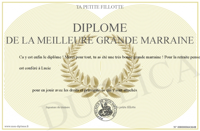 Envoyez par email votre Diplôme de la meilleure grande marraine personalisé
