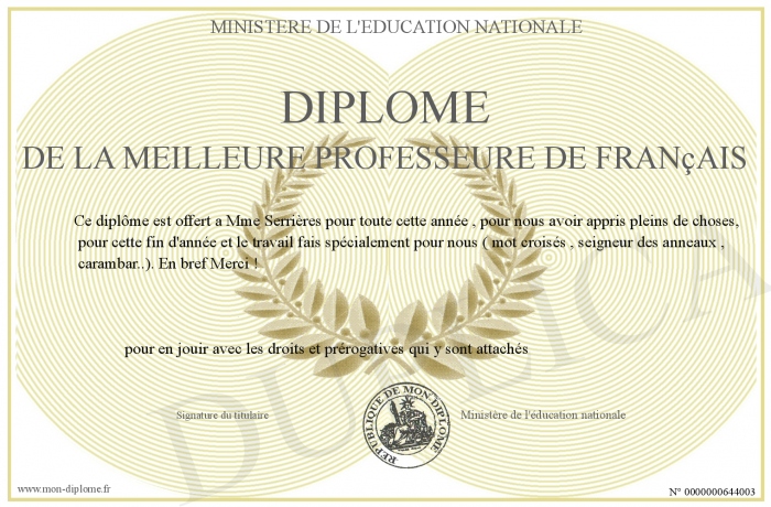 Envoyez par email votre Diplôme de la meilleure Professeure de Français personalisé