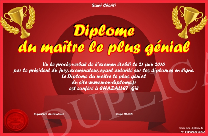 Envoyez par email votre Diplôme du maître le plus génial personalisé