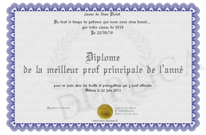 Envoyez par email votre Diplôme de la meilleur prof principale de l'anné personalisé