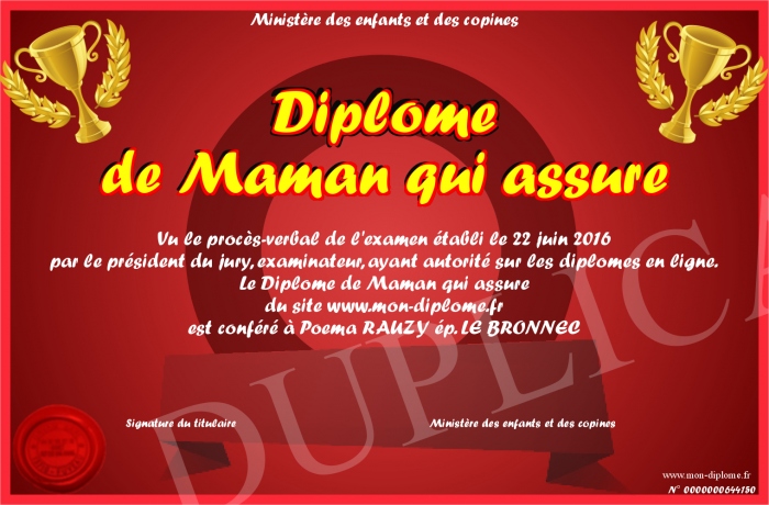 Envoyez par email votre Diplôme de Maman qui assure personalisé