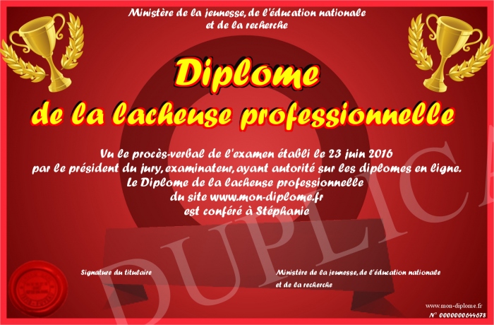 Envoyez par email votre Diplôme de la lacheuse professionnelle personalisé