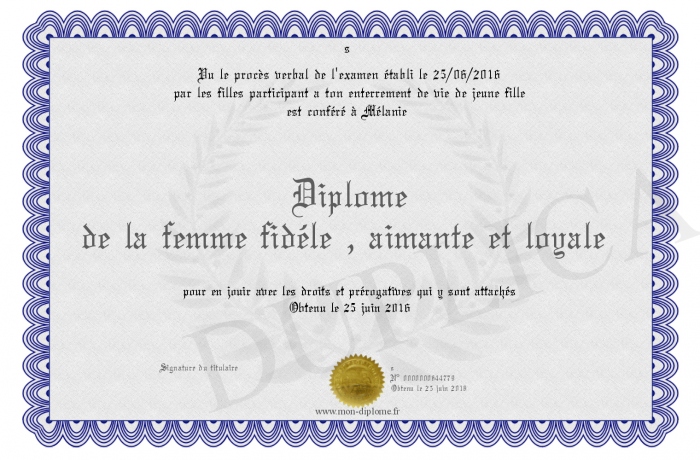 Envoyez par email votre Diplôme de la femme fidéle , aimante et loyale personalisé