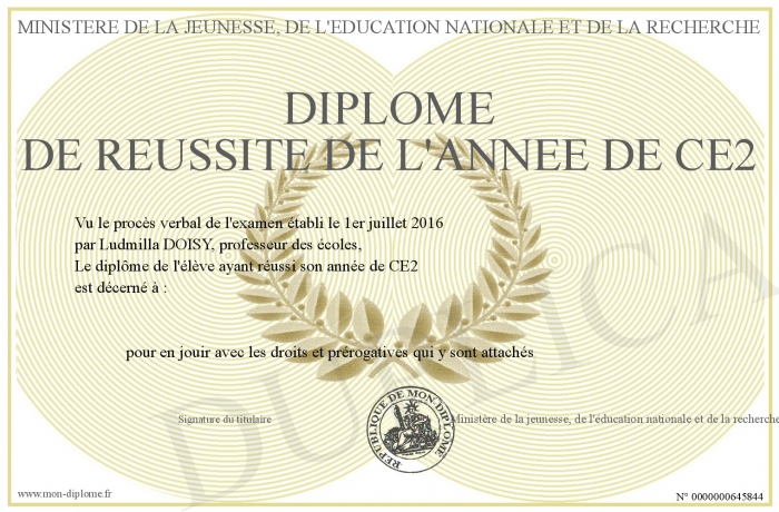 Envoyez par email votre Diplôme de Réussite de l'année de CE2 personalisé