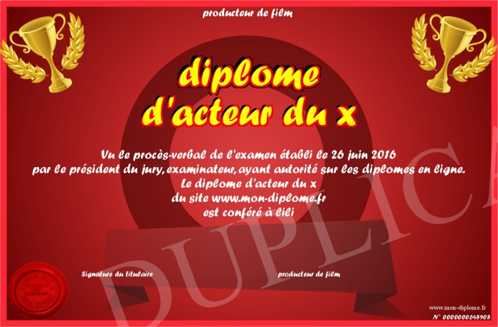 Envoyez par email votre diplôme d'acteur du x personalisé