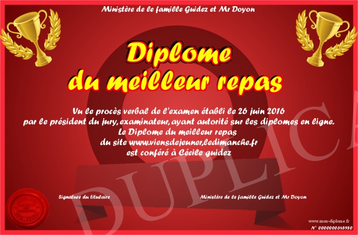 Envoyez par email votre Diplome du meilleur repas personalisé