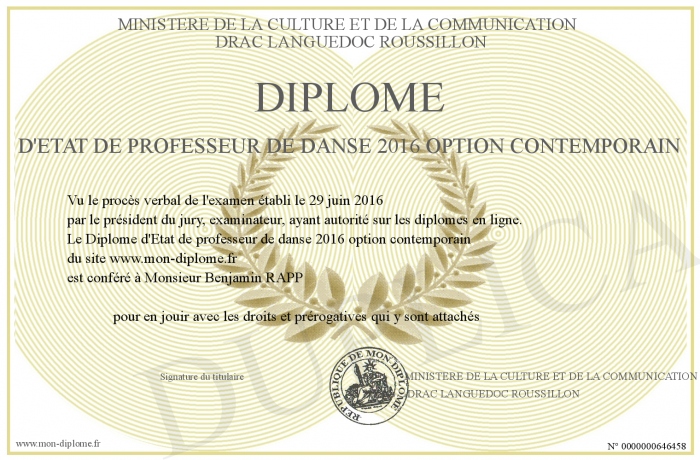 Envoyez par email votre Diplôme d'Etat de professeur de danse 2016 option contemporain personalisé