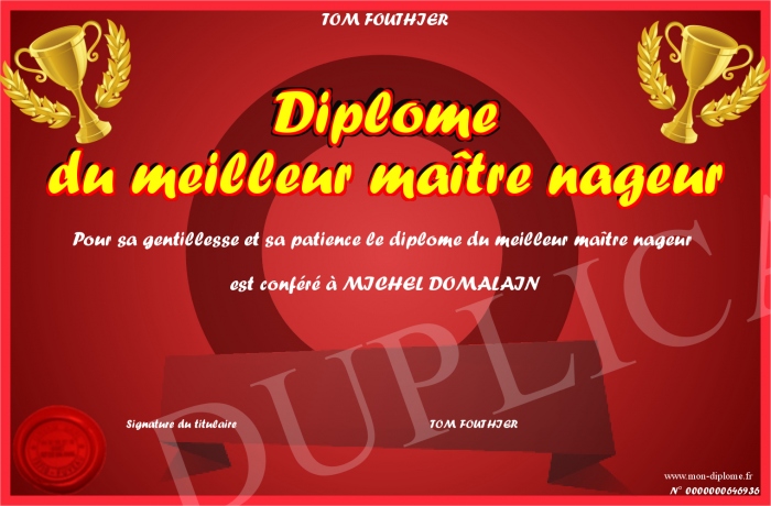 Envoyez par email votre Diplôme du meilleur maître nageur personalisé