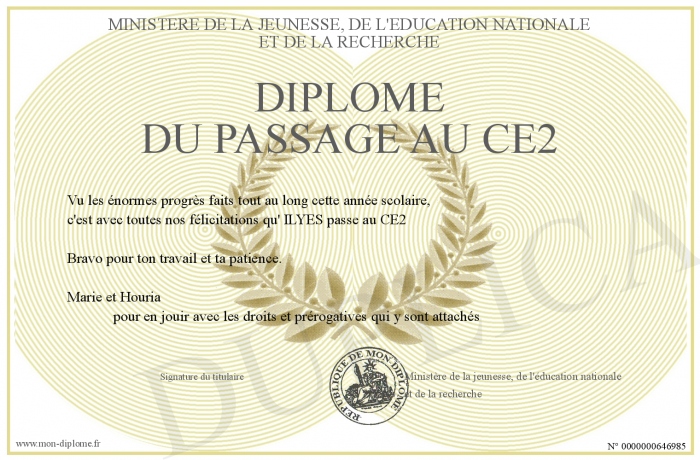Envoyez par email votre Diplôme du passage au CE2 personalisé