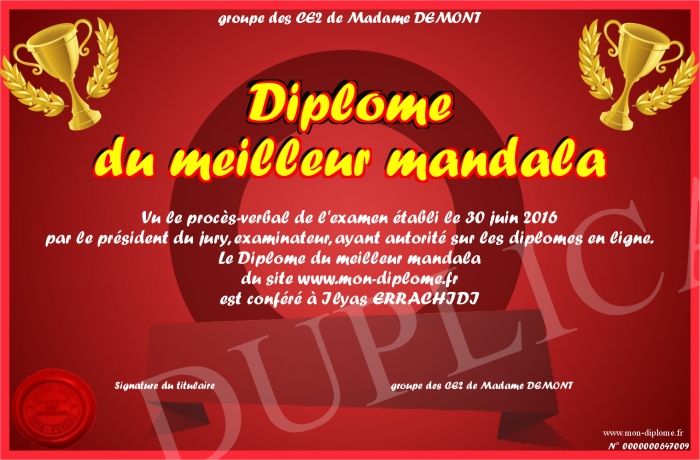 Envoyez par email votre Diplôme du meilleur mandala personalisé