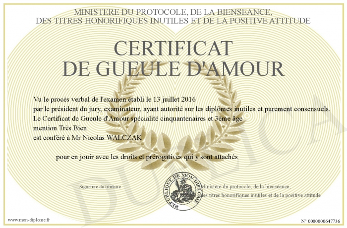 Envoyez par email votre Certificat de Gueule d'Amour personalisé