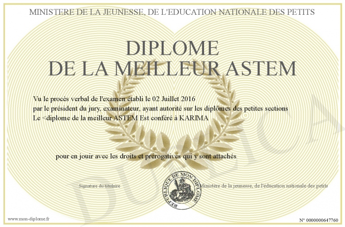 Envoyez par email votre Diplôme DE LA MEILLEUR ASTEM personalisé