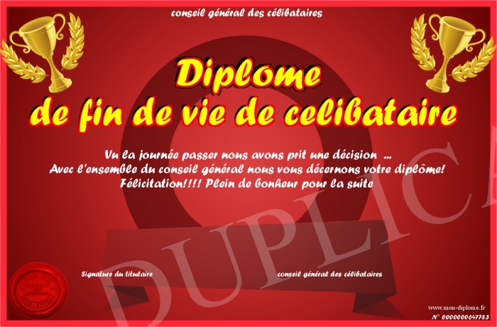 Envoyez par email votre Diplôme de fin de vie de celibataire personalisé