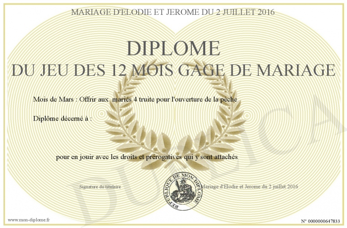 Envoyez par email votre Diplome du jeu des 12 mois gage de mariage personalisé
