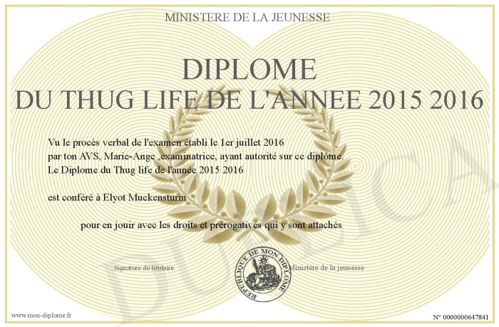 Envoyez par email votre Diplôme du Thug life de l'année 2015 2016 personalisé