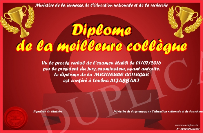 Envoyez par email votre Diplôme de la meilleure collègue personalisé